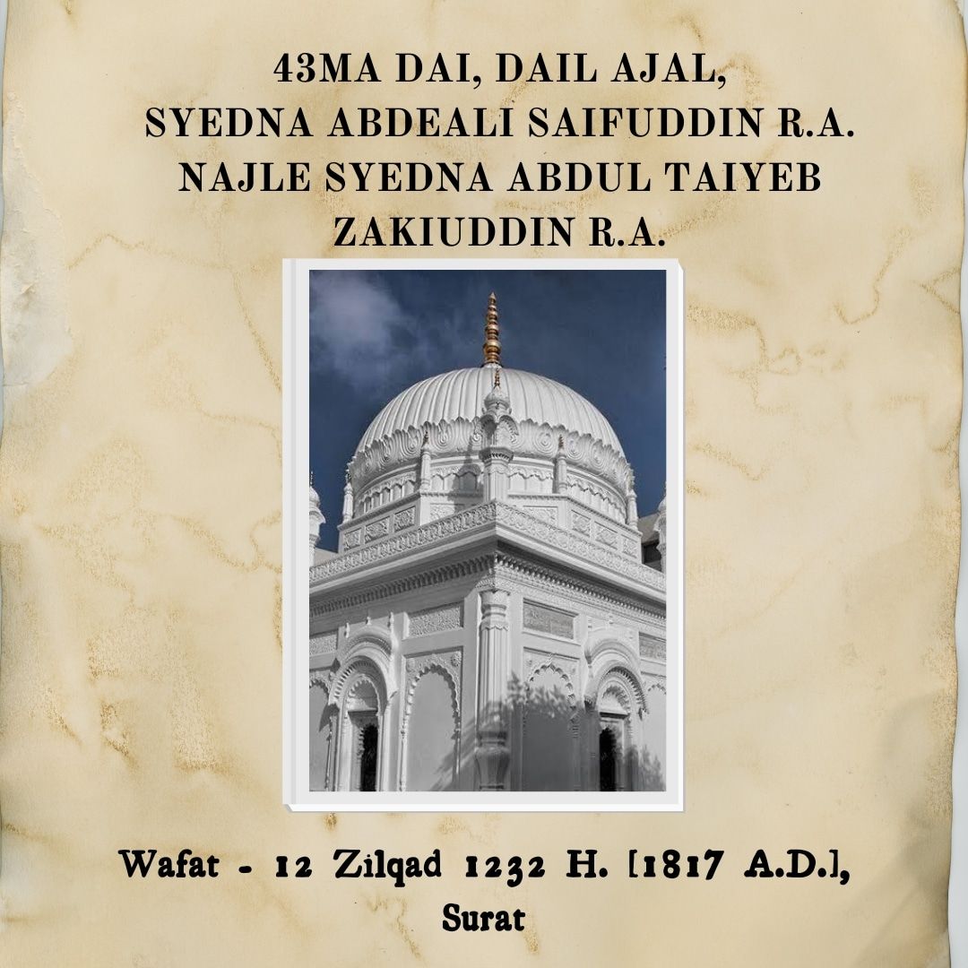 🔸43ma Dai Maulana Abdeali Saifuddin {RA} 7ma Satra na Pehla Dai chhe, Aap Do’at Mutlaqeen {RA} ma Aaftab na Manzelat ma tha, Olamaa Aap ne Mo'ayyad Al-Asger Kehta,